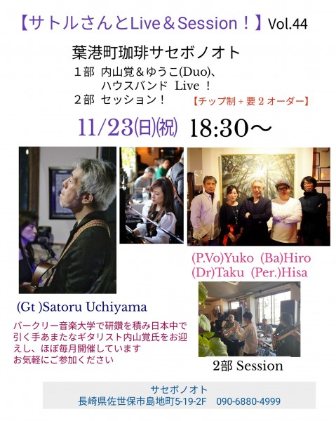 ★ 11月23日(日)サトルさんとライブ&セッション!vol.44■場所 : 佐世保『サセボノオト』■住所 : 長崎県佐世保市島地町5-19 島地クルサ2F■電話 : 0956-60-9307■時間 : 18:30スタート ■料金 : チップ制+要2order■メンバー : 内山覚(g)・松尾ゆうこ(p & vo)☆1st DUO Live / 2nd Jam Session■備考 : 皆さんで楽しみましょう^_^久しぶりの日曜開催です。